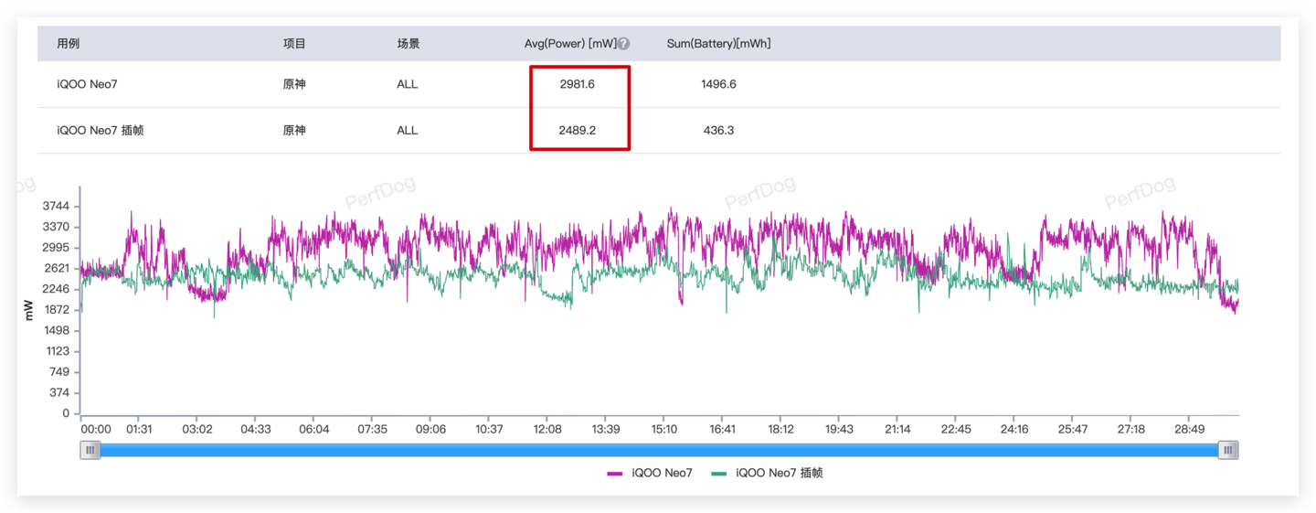 在《原神》游戏中,iQOO Neo7 达到了 5.96W(双电芯:2981mW*2),帧能耗为 101.8mW,这个表现,同样要远优于骁龙 8 旗舰机(基本都在 6W、甚至 7W 之上);和骁龙 8 + 的整体表现相似。