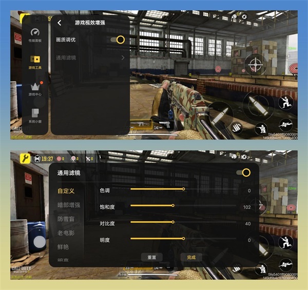 iQOO Neo7 的游戏视觉增强加入了很多种模式,以《使命召唤手游》为例,除了“视觉调优”之外,还额外加入了诸如暗部增强、防雪盲、老电影、鲜艳、明亮以及自定义等模式的通用滤镜,用户可以根据自己需求,自行选择或自定义设置,妥妥一“物理外挂”。