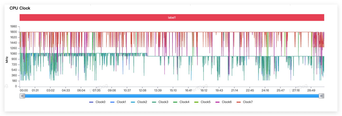 如下图所示,在 30 分钟的游戏中,iQOO Neo7 的 Cortex-X2 超大核心,在 1.8Ghz-1.2Gzh 之间波动,大部分时间维持在 1.8Ghz 上;Cortex-A710 三颗核心,同样维持在 1.8Ghz 左右,但偶尔降到 1.0Ghz;另外 Cortex-A510 能效核心,则大部分时间维持在 1.0Ghz 之下。由此判断,在《原神》游戏中,四颗大核心(1+3)是相对亢奋的,虽然没全力跑,但基本算是时刻保持战斗状态。