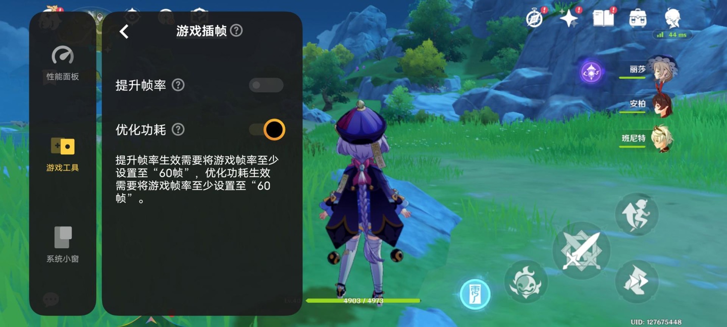 以《原神》游戏为例,侧边栏划出快捷工具后,可以开启“游戏插帧”功能,并且提供了提升帧率、优化功耗两个选项,“提升帧率”是将原本 60 帧的游戏,通过插帧的方式以更高的帧率运行。