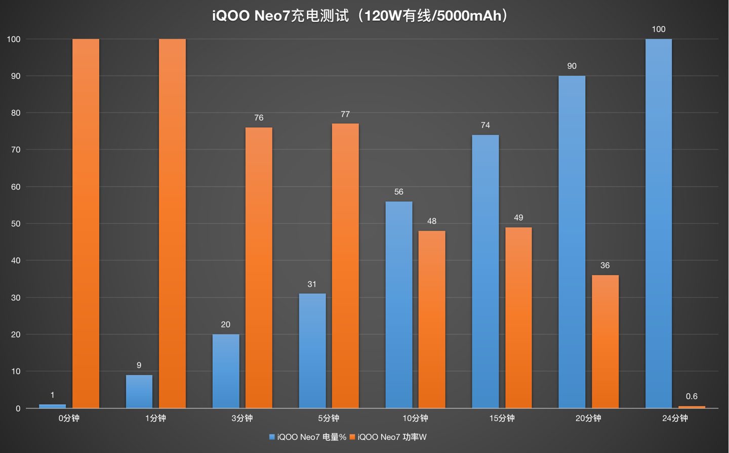 据官方说法,该模式下,iQOO Neo7 的 5000mAh 电池,至快 9 分钟从 1% 充至 50%,从 1% 充至 100%,开启极速模式仅 25 分 30 秒。