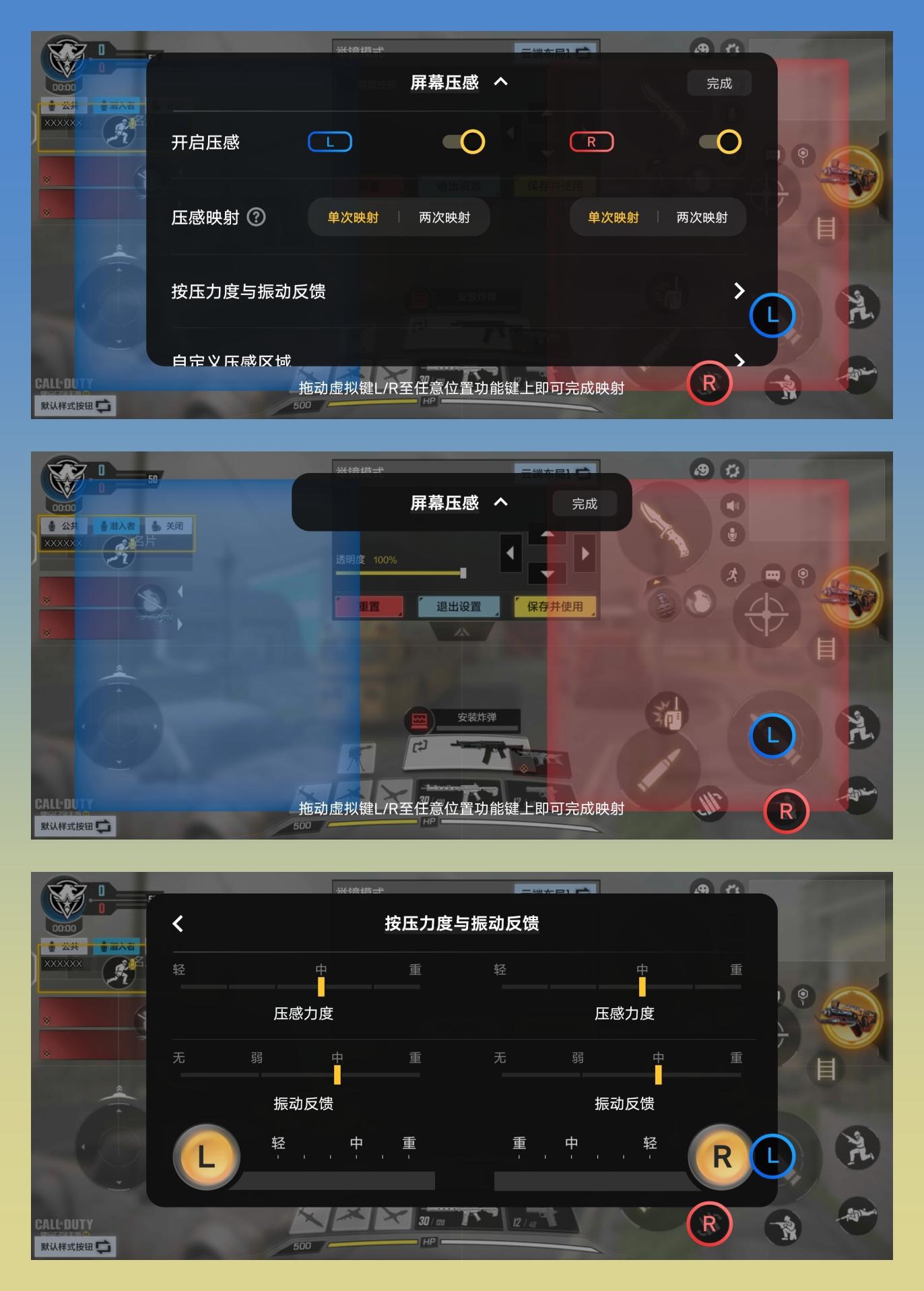 你可以将左右两侧的按压区域映射游戏中相应的功能按键,从而实现两个维度的操作,在设置中,你还可以设置相应的按压力度、振动反馈力度等等。