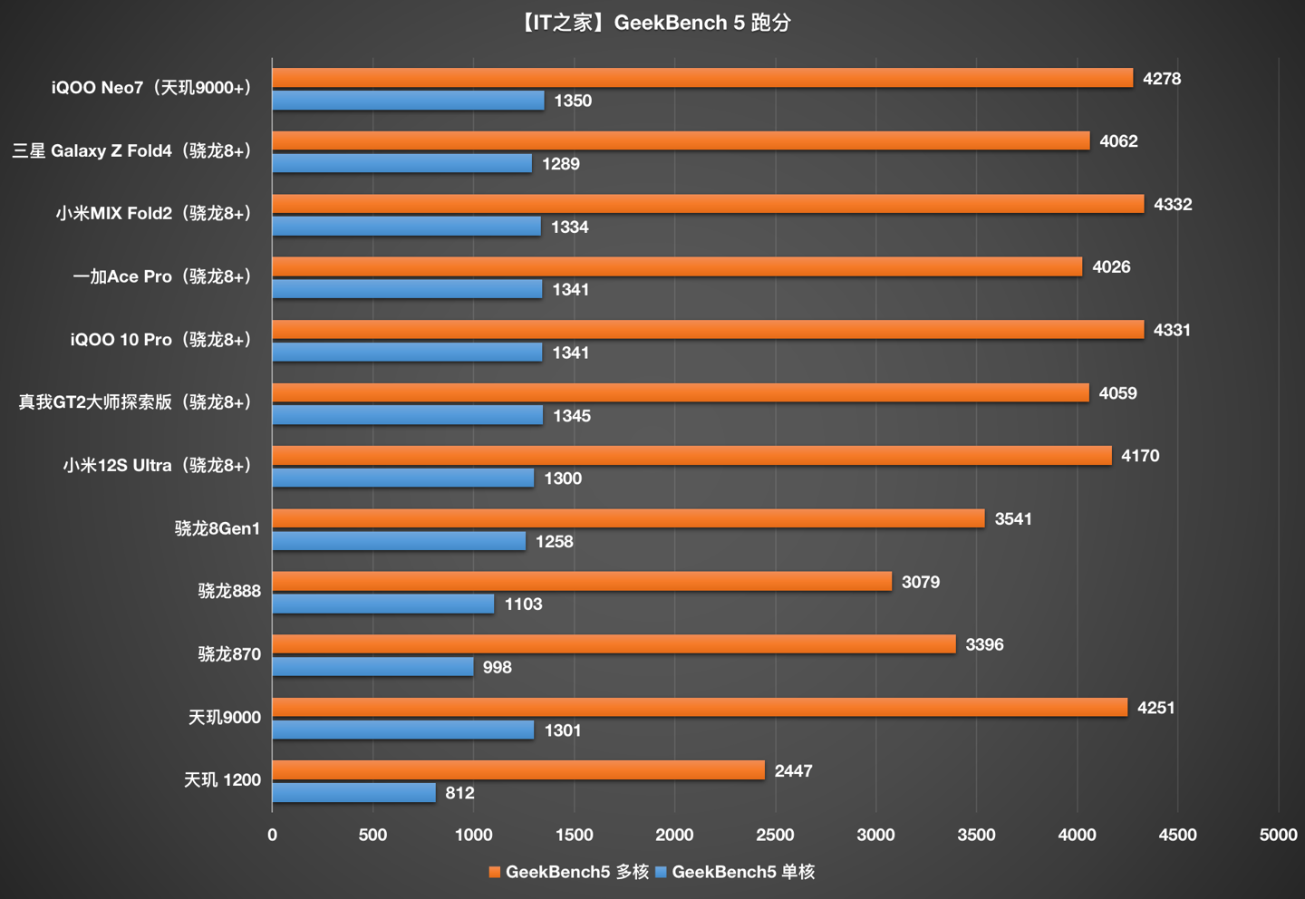 GeekBench 5 跑分方面,iQOO Neo7 单核为 1350 分,多核达到了 4278 分,这也是笔者目前测试的所有安卓旗舰机中,单核分数最高的一台,事实上也基本是安卓阵营最强的 CPU 跑分成绩了。
