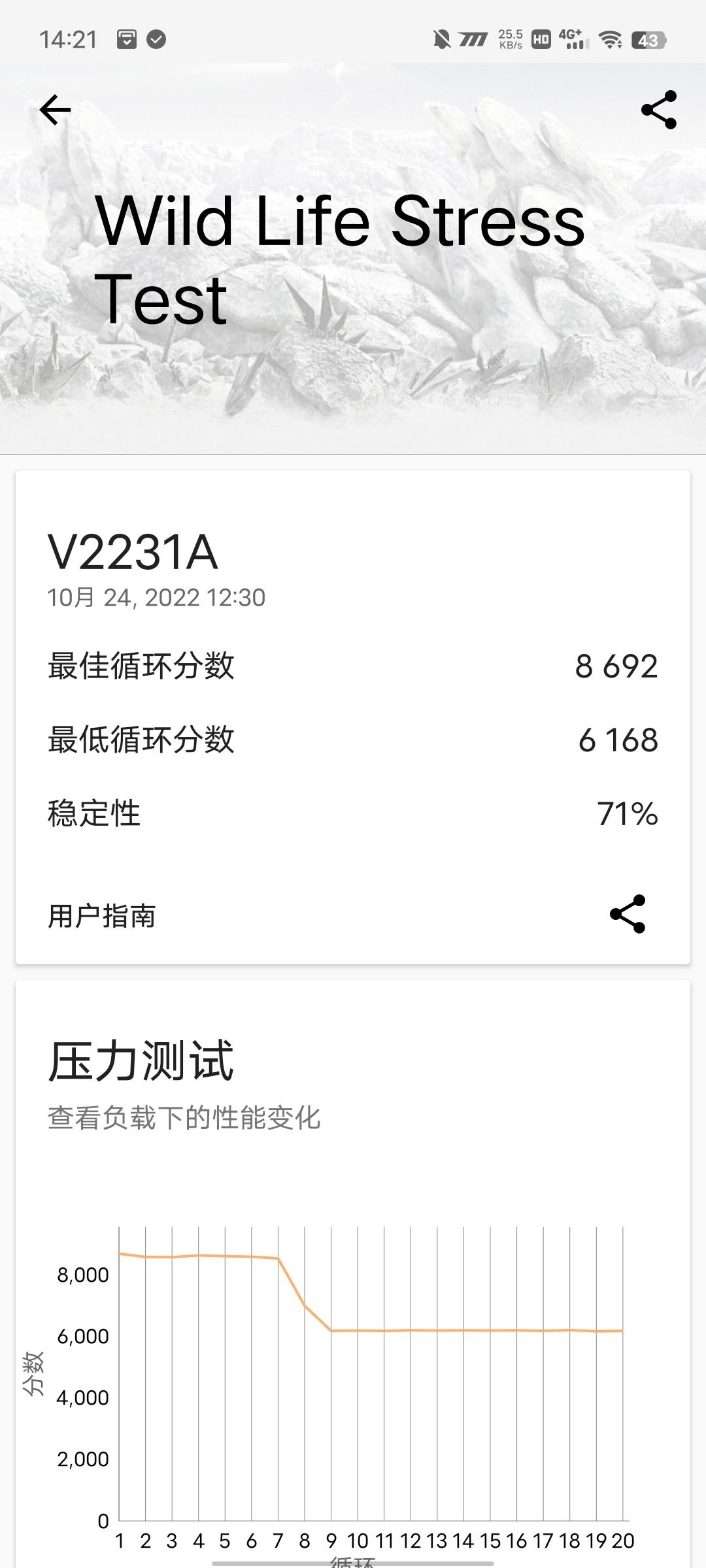 3DMark 的 Wild Life Stress Test 项目中,iQOO Neo7 获得了 71% 的稳定性,表现尚可;