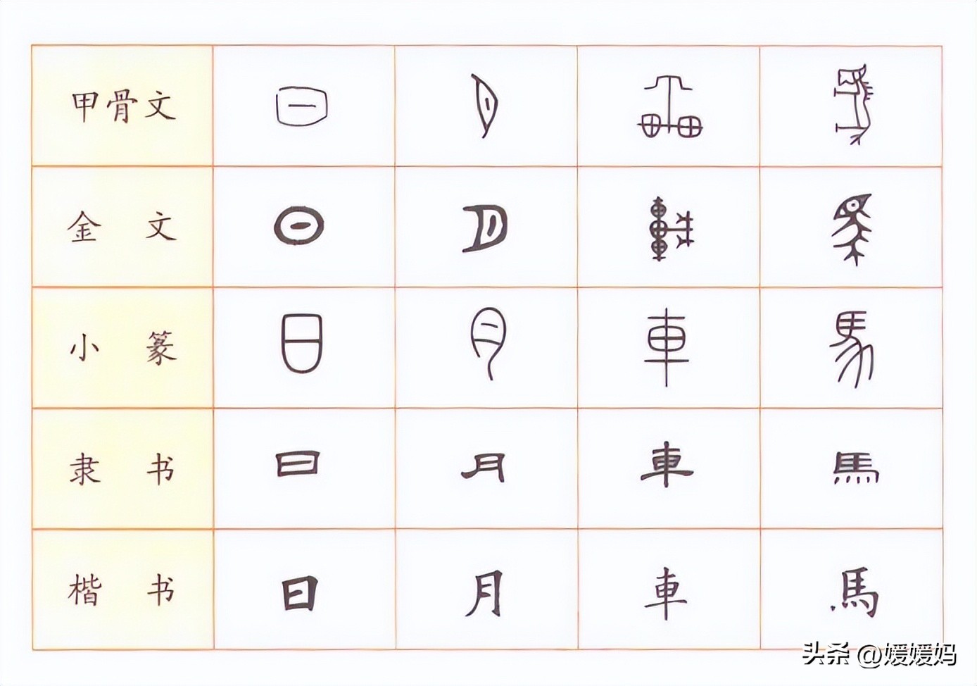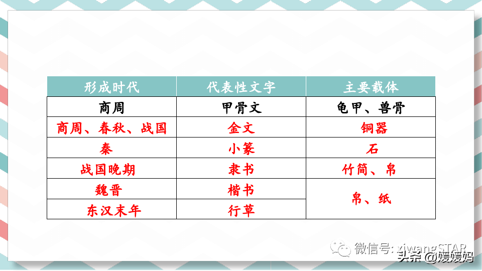 小结:课文首先用表格的形式,以“日、月、车、马”四个字为例,展示了几千年来汉字的演变过程,并一一介绍了甲骨文、金文、小篆、隶书、楷书等出现的时间以及特点。