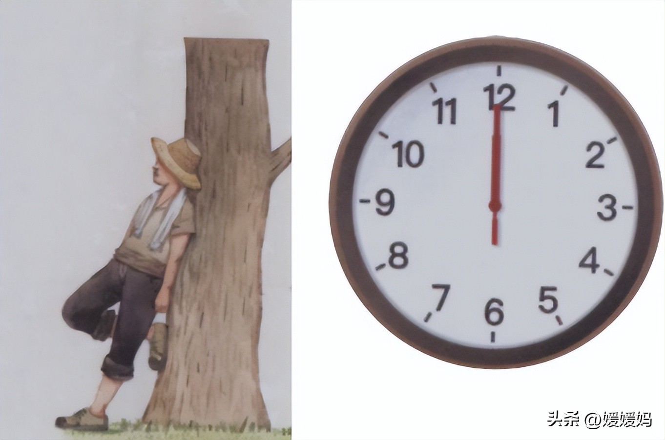 这两个是画面猜谜, 分别是“人”在“木”旁(休),十二点→十加两点(斗)。