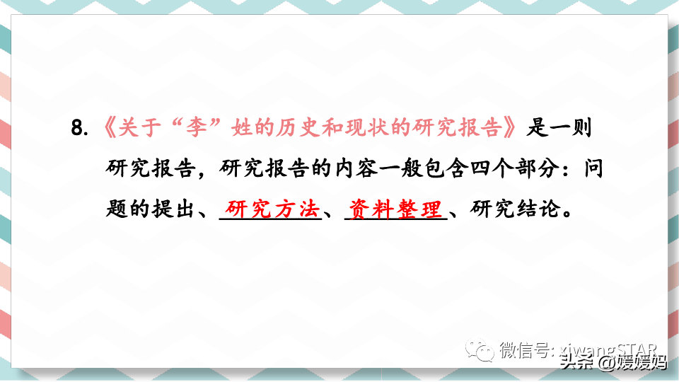 小结:通过材料分析,我们可以发现,一篇完整的研究报告不仅需要搜集资料,还要有:研究标题、研究目的、研究方法、整理资料、研究结论。