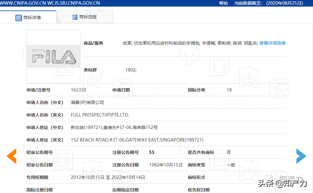 笔者在中国商标网搜索发现,FILA商标仍属于满景(IP)也就是有限公司FULL PROSPECT(IP)PTE.LTD。