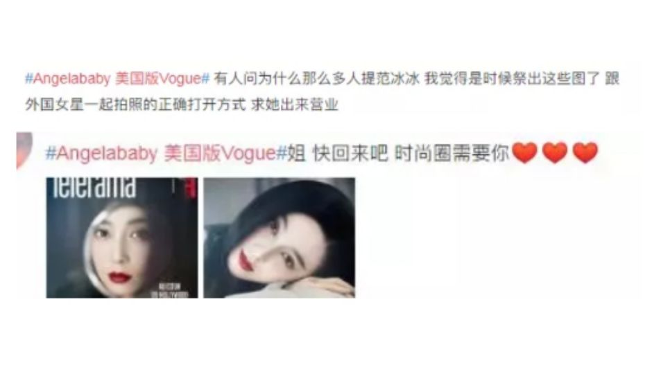 事情是这样的,日前美版vogue在全球范围内选择了7位知名女星登上封面,由于选择标准非常苛刻(包括一定要是80后、会英语、在国际上有相应知名度、在本国文艺界和时尚界有足够的话语权等),而我国80后花旦又实在是拿得出手的不多,所以最后这个扬名立万的大饼落到了baby头上,可是由于baby体质实在是招黑,所以后续网上出现了不少diss她“不配代表我国人才(该杂志的本月主题就是全球人才)”的声音,面对这一情况,baby这边本来就已经够尴尬的了,不料范BB那头却再度借机做起了文章,接连在各大媒体上po出了类似于如果范BB还在圈内,肯定比baby更加担得起这“global talent”的美誉,为群嘲baby的浪潮又添了一把大火。