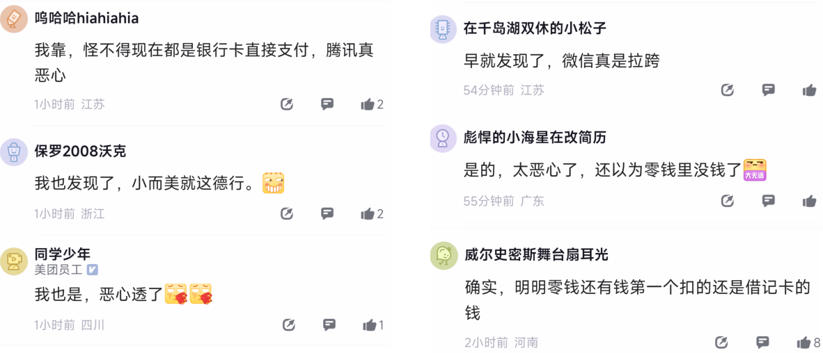 但是对于用户而言,悄悄改变支付方式真的很难以接受。微信体系中的零钱无收益、零钱通收益率低,大部分人都更倾向于将这些钱花出去,然而微信的这波骚操作减缓了这项进程。对此,你有什么看法呢?欢迎在评论区留言~