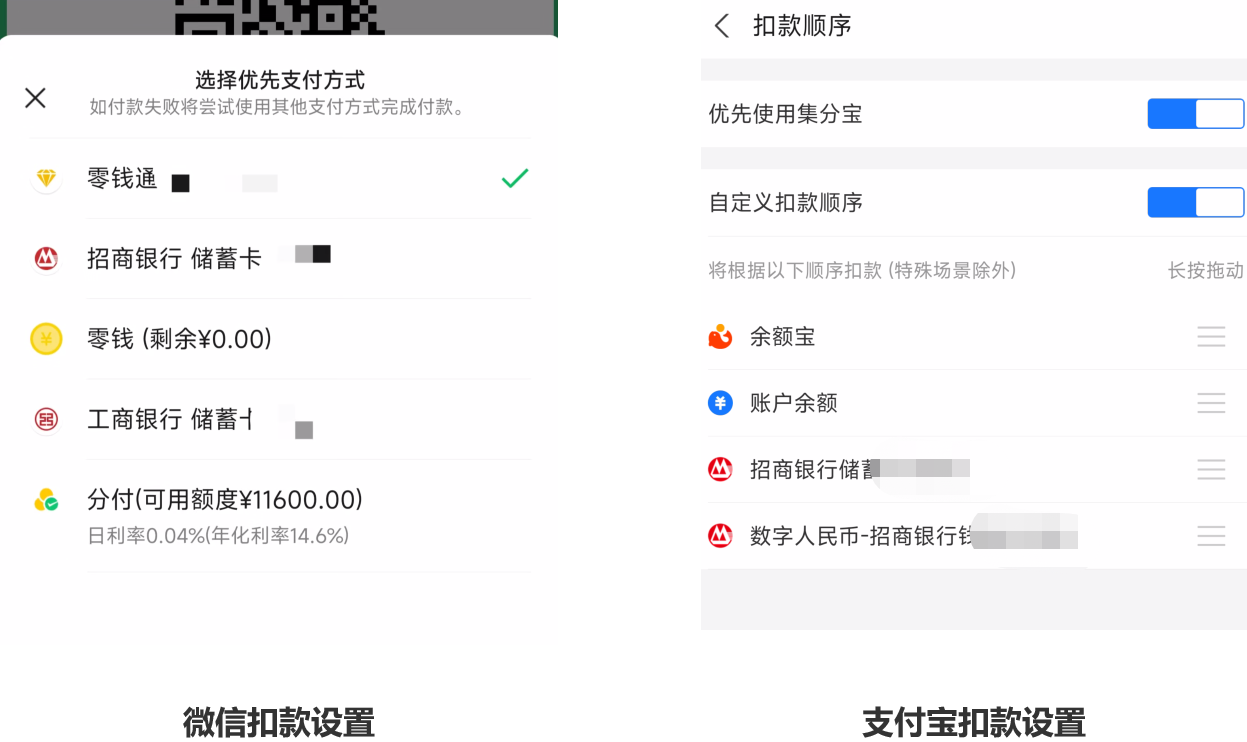 在微信支付的产品逻辑里,微信并不能自定义付款的顺序,默认会使用上一次的支付方式。用户可以在“收付款”功能中设置优先支付方式,但是并不能与支付宝一样灵活调整扣款顺序。在实践中笔者发现,就算上一次使用了零钱支付,但是下一次进行支付时依然优先使用借记卡(零钱有余额)。
