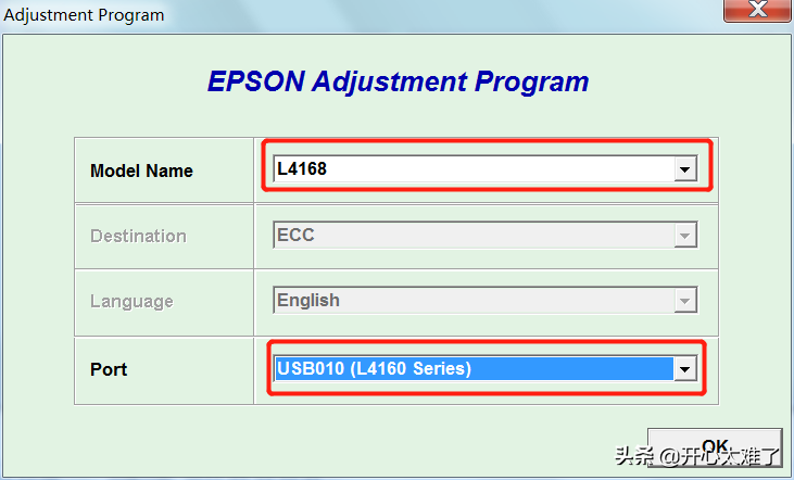 第一个选择框选择打印机型号。如果没有所要清零的打印机型号,就是清零软件下载错了。第二个选择框选择打印机使用的端口。