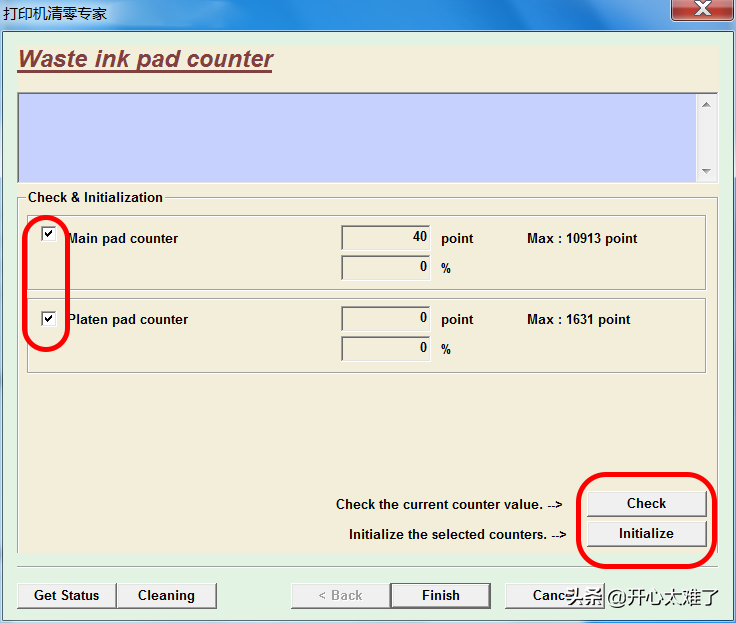 勾选上中间左边的两个方框。点击“Check”查看当前打印机数值。因为这台打印机我刚清零了,所以数值是0,没有清零的不是。重新勾选两个方框,点击“lnitialize”进行清零。