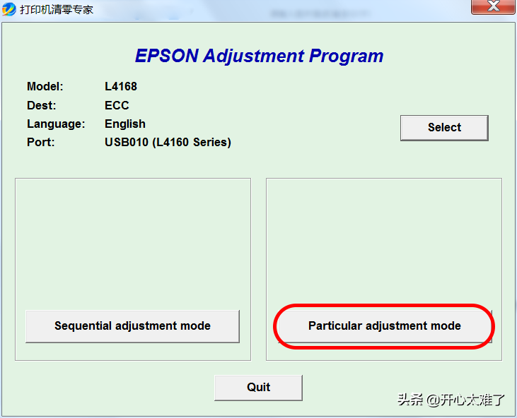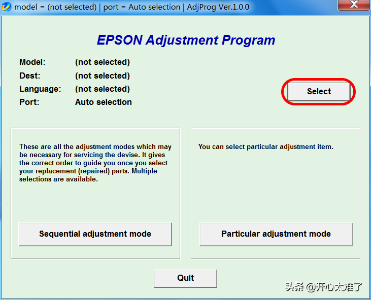 打开清零软件,首先点击“Select”。设置打印机型号和端口。