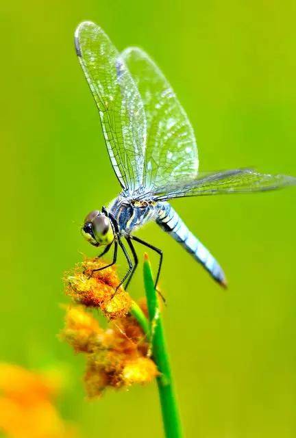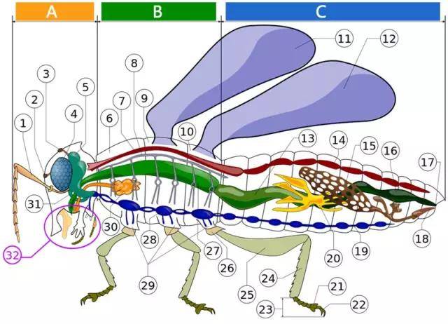 昆虫是无脊椎动物,身体分为头、胸、腹三个部分,其中大部分种类的胸部长着三对足和两对翅并且可以飞翔,正可谓:六足四翼,翱翔天地。