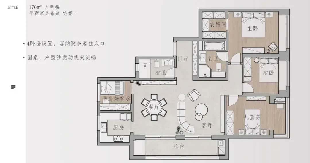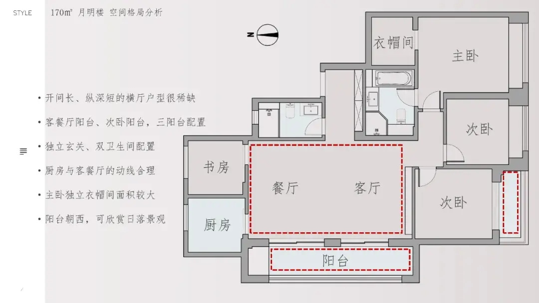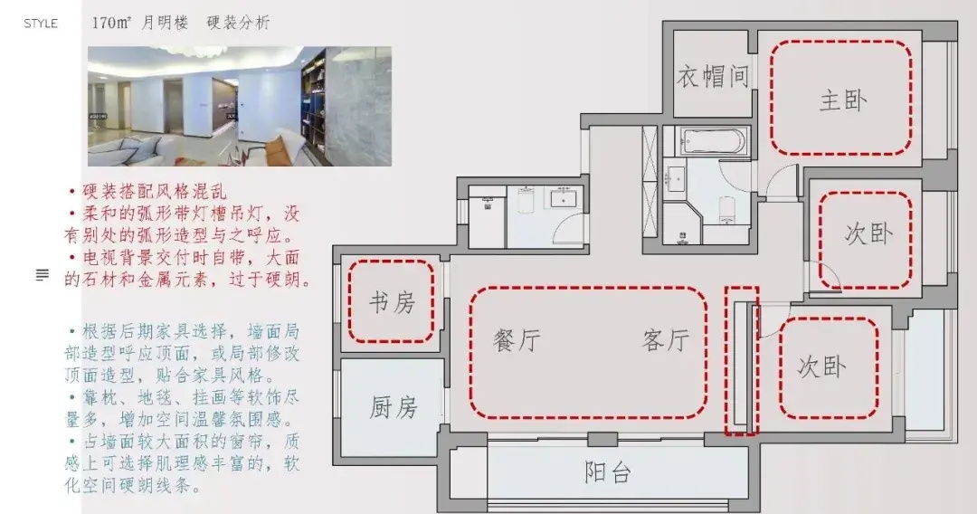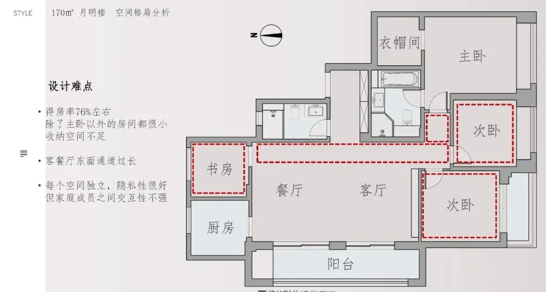 缺点:得房率76%左右,售房面积为170平米,套内可使用面积只有120平米左右,客餐厅占比面积较大,所以除了主卧以外,其余每个房间分配到的面积就很小了,这样每个空间的独立收纳就略显空间不足。