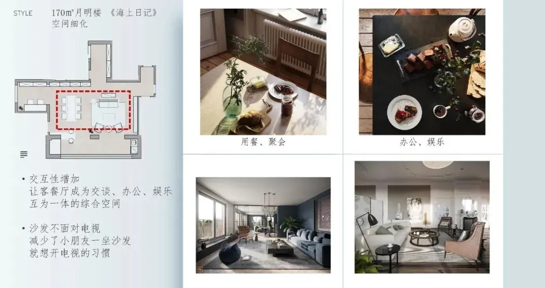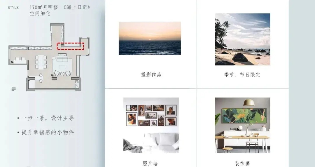 下面我们来看一下局部的划分,既然是把家作为了一个日记本,屋主自然是希望家里充满了他们生活的故事性的,客厅东面墙的装饰可以是一些他们出游时拍的照片,一家人和合照照片墙,或者是可以根据不同的季节、节日来随意更换。
