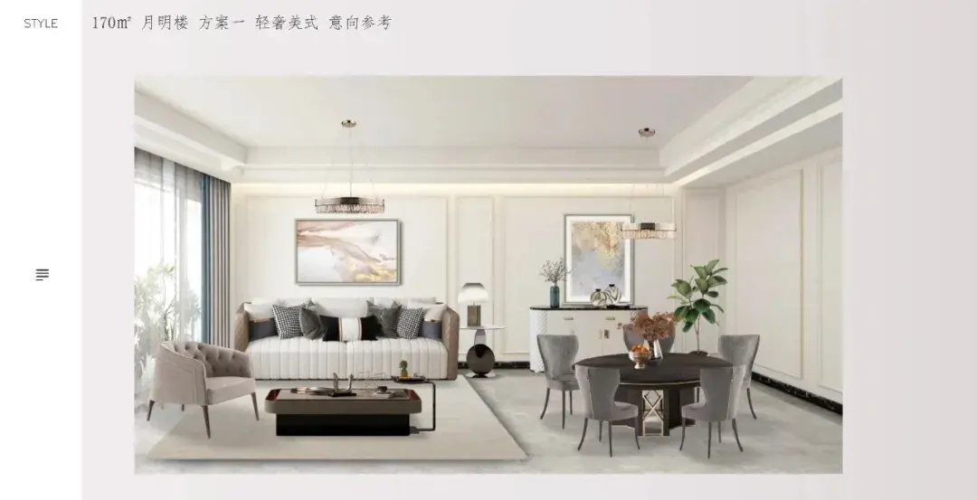 这张是基于客餐厅的布局做的一个美式轻奢风格的家具、灯具、墙面造型、窗帘、挂画的搭配效果。