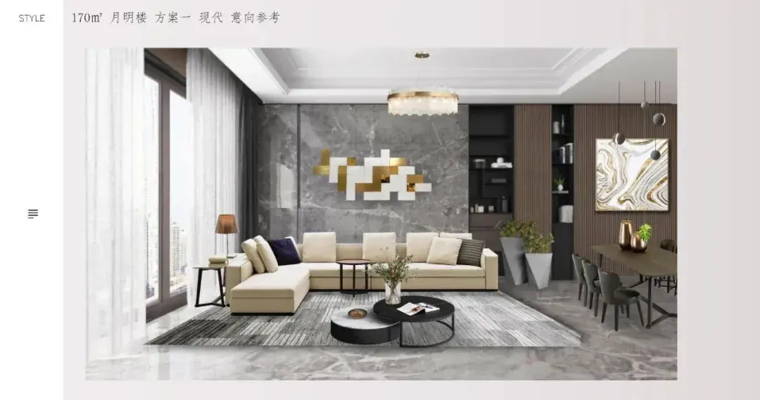 第二张是基于基础硬装背景墙的大理石墙面,金属开放柜,做的一个现代风搭配意向。