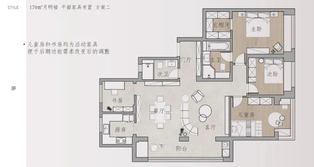 首先南边主次卧的布局没有改变,这里就不再过多介绍,儿童房的设定是两个岁数相差不大的孩子居住,依然考虑的都是活动家具。如果孩子是同性别,那他俩睡到成年也是没有问题的。如果是不同性别,初中以后北边的卧室就可以按照上一稿方案的设置作为卧室来使用。