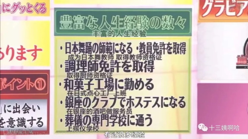 她做过入殓师,在和果子工厂熬制过沙馅,有英文教师资格,有烹饪师资格,做过银座陪酒小姐。