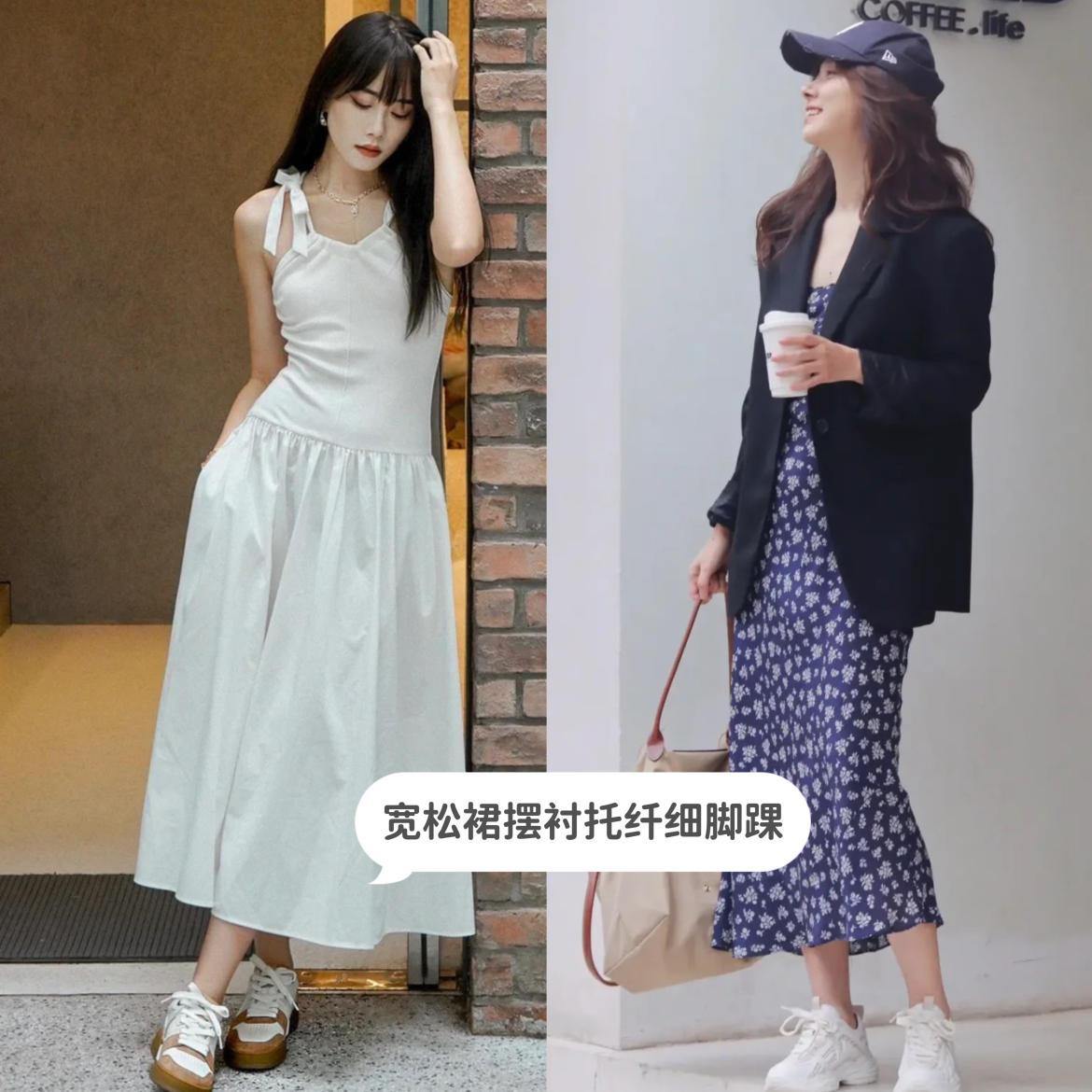 穿连衣裙搭配运动鞋,确实没有高跟鞋搭配看起来更加轻盈,我们就需要在具体搭配的时候重点体现轻盈感,通过露出脚踝,增加留白度会比较合适,露出你的脚踝立马可以显瘦,而且还可以转移部分的注意力。