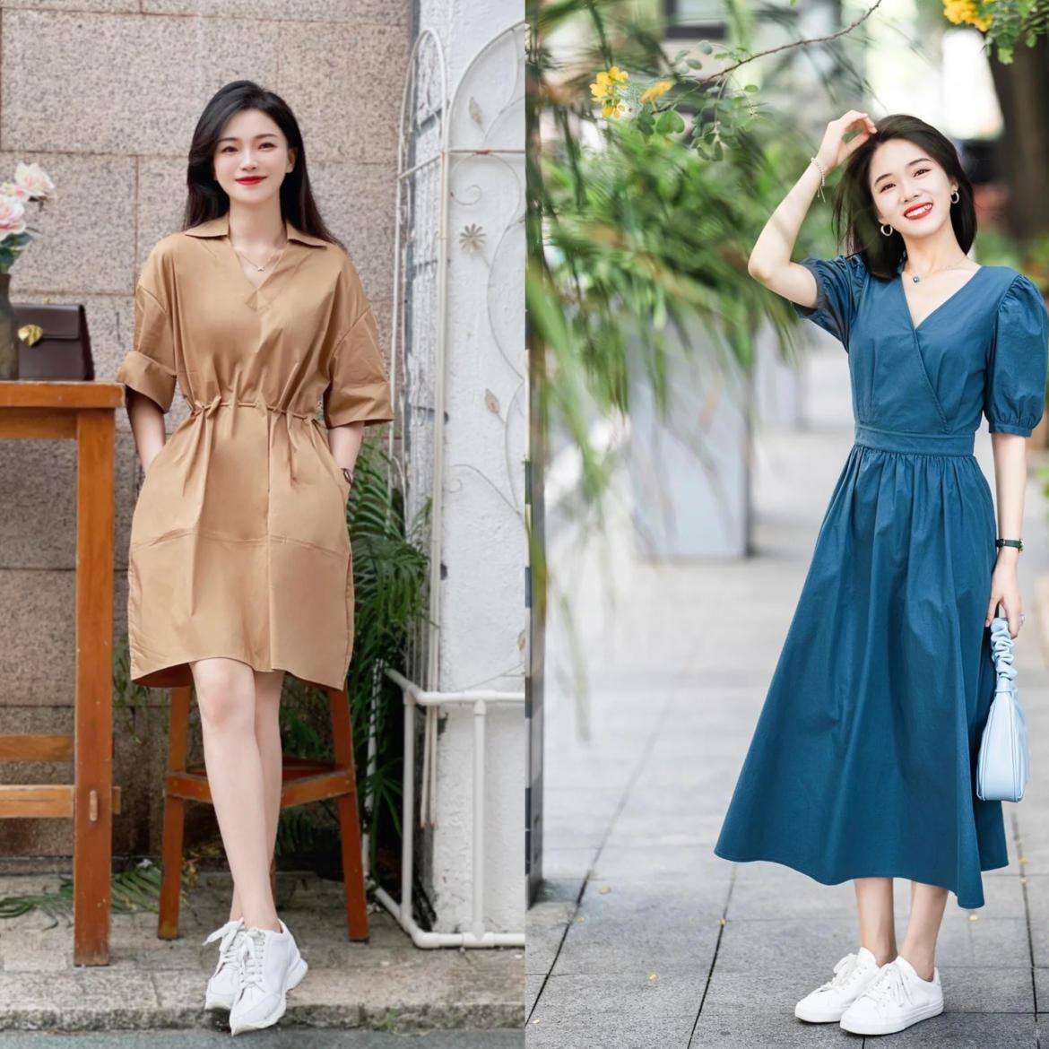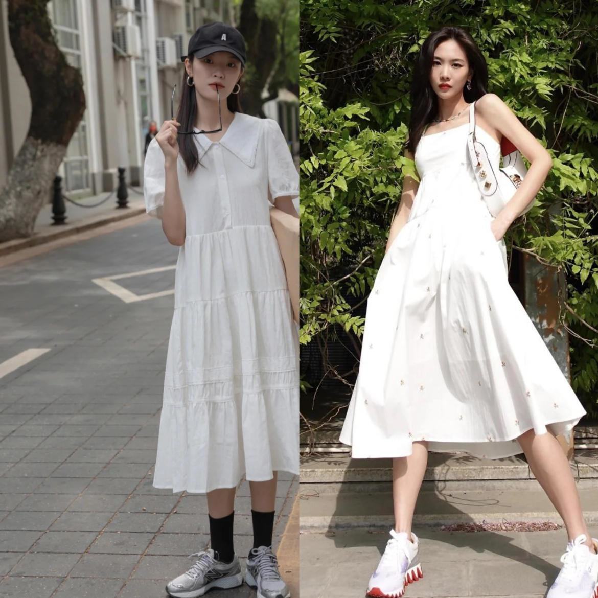 不管是长款连衣裙还是短连衣裙,具体搭配的时候还是推荐挑选宽松裙摆的设计,裙摆宽松,意味着包容性更强,可以挡住大腿,修饰我们的下半身,并且衬托出更加纤细的小腿曲线和脚踝。