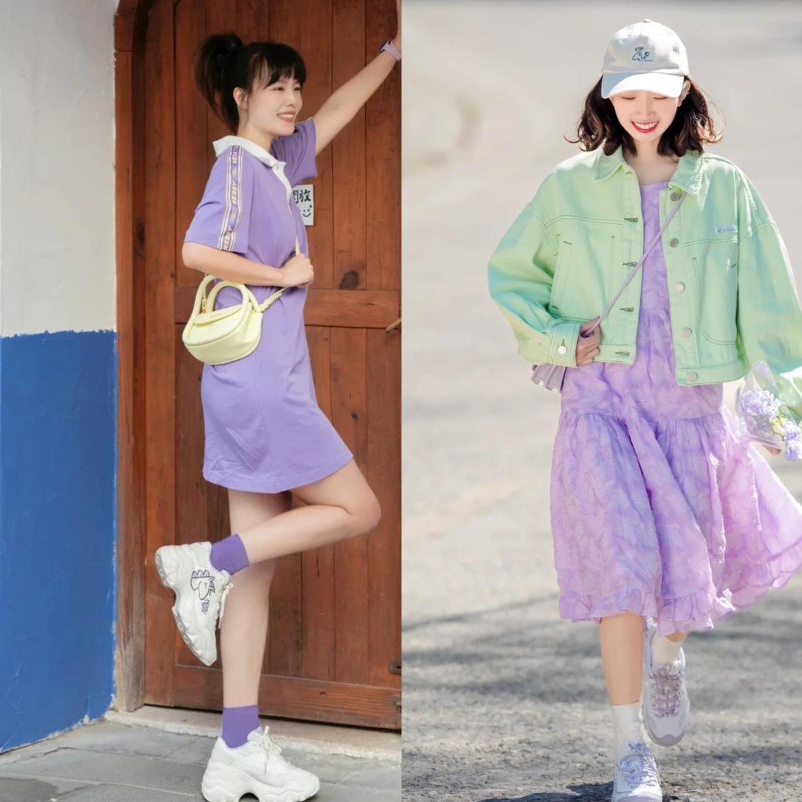 连衣裙真的有太多不同的款式了,夏季的搭配要缤纷多彩,姐妹们可以安排上各种彩色连衣裙,时髦的亮色连衣裙让你的造型变得更出彩,例如紫色连衣裙都非常浪漫,显白有气质,搭配白色的老爹鞋,颜色之间很匹配,轻盈感很强。