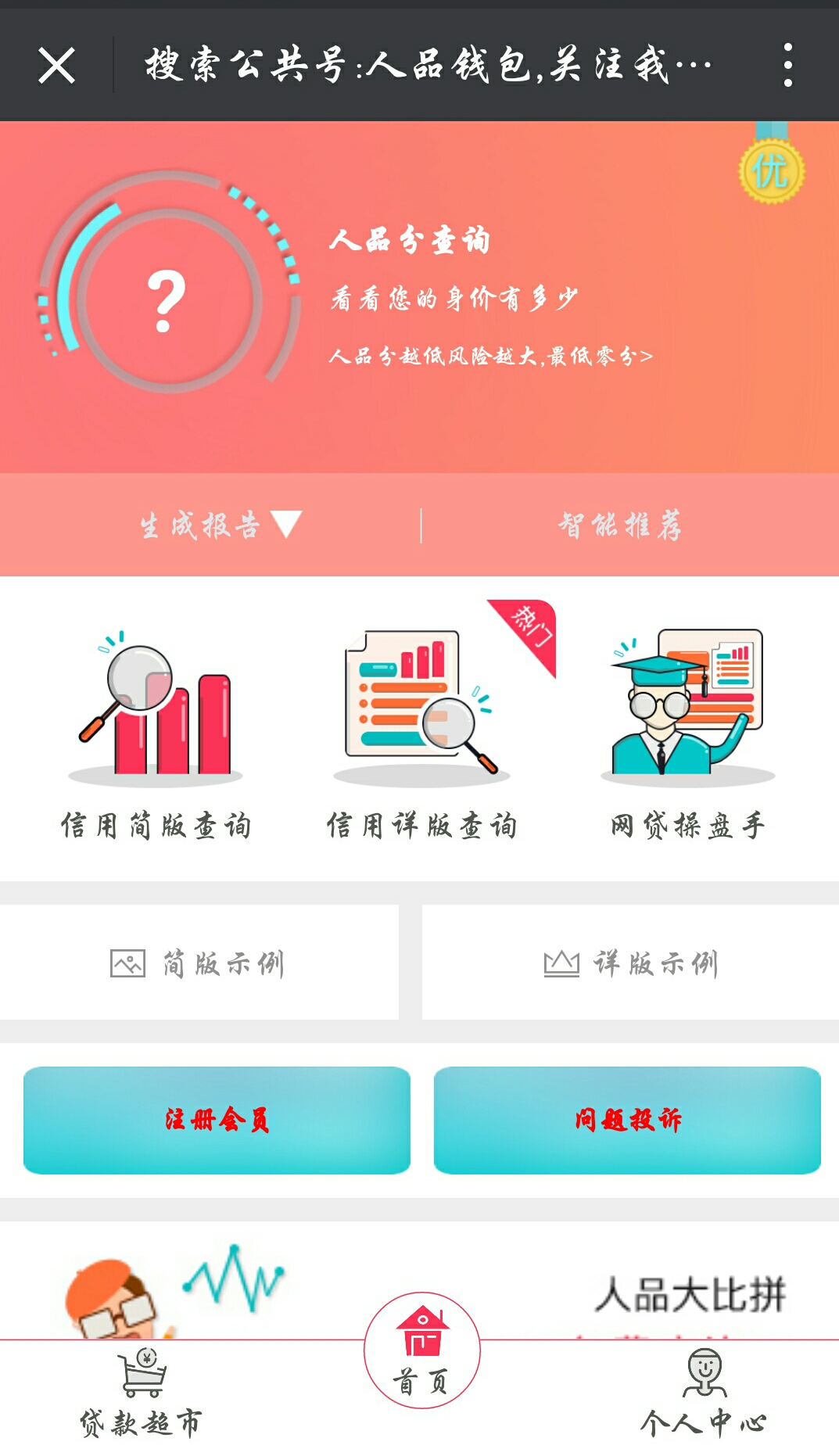 以上三个就是可以查询到自己的信用分平台,如果大家感兴趣可以用微信搜索公众号关注,建议关注人品钱包查询。你可以进去查询自己的信用分数多少,并且做了哪些网贷平台,里面都会有详细记录。这就是你的同盾大数据。