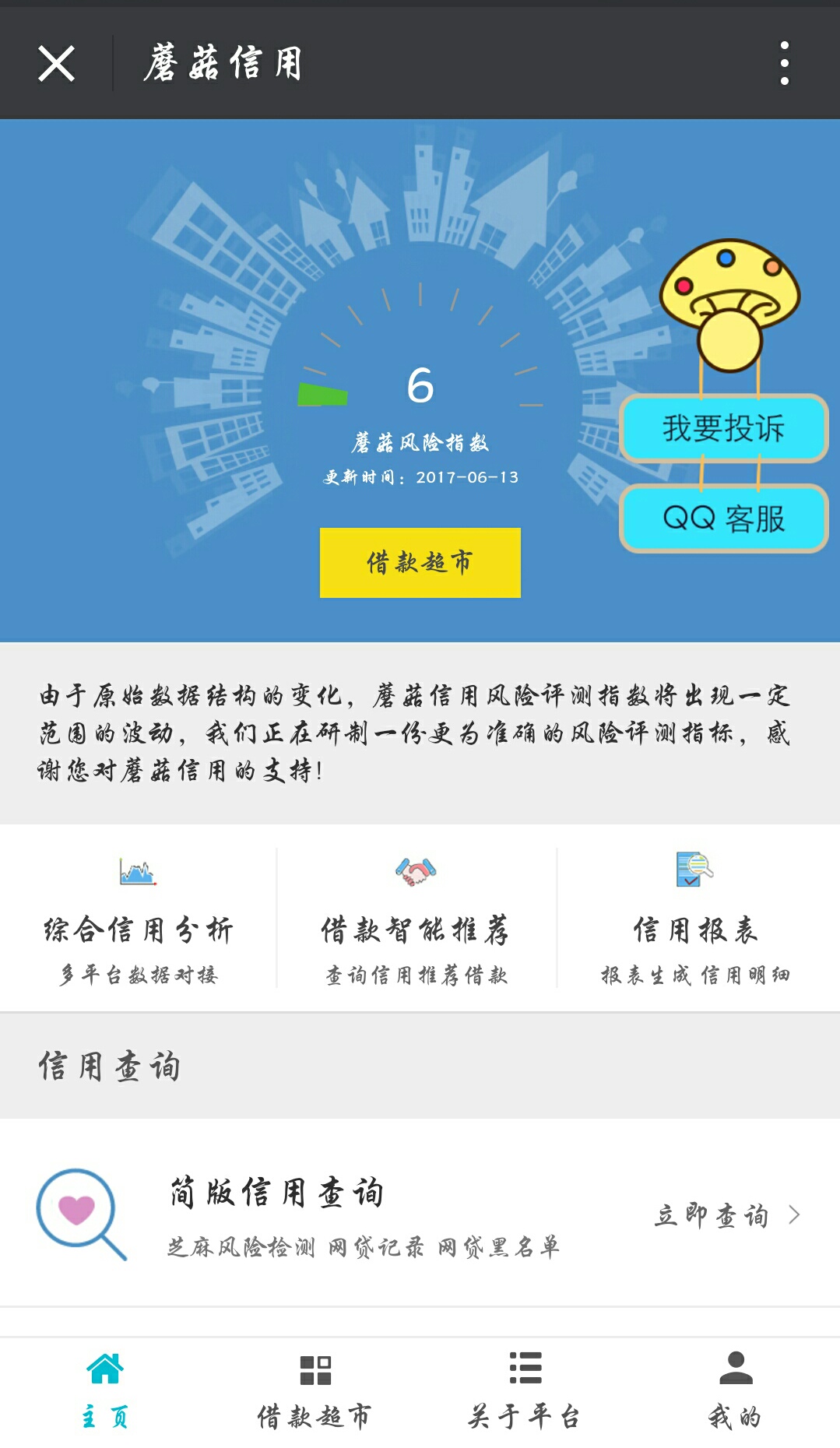 蘑菇信用。蘑菇信用跟周易钱庄差不多,也是分数越低信用越好。只需要输入姓名和身份证号就可以查询了,里面会详细地显示你一共有多少笔网贷,又有哪些网贷平台等等内容。