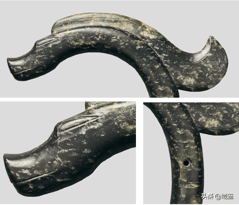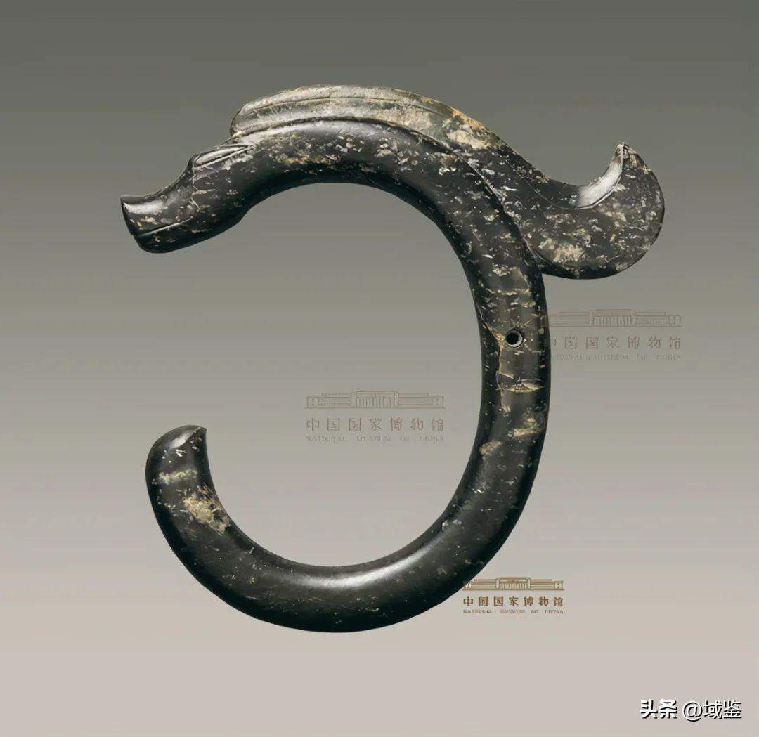 该器物高26厘米,完整无缺,体蜷曲,呈C字形。吻部前伸,略向上弯曲,嘴紧闭,有对称的双鼻孔,双眼突起呈棱形,有鬣,身体呈墨绿色。龙背有对称的单孔,经试验此孔用于悬挂,龙的头尾恰好处于同一水平线上。