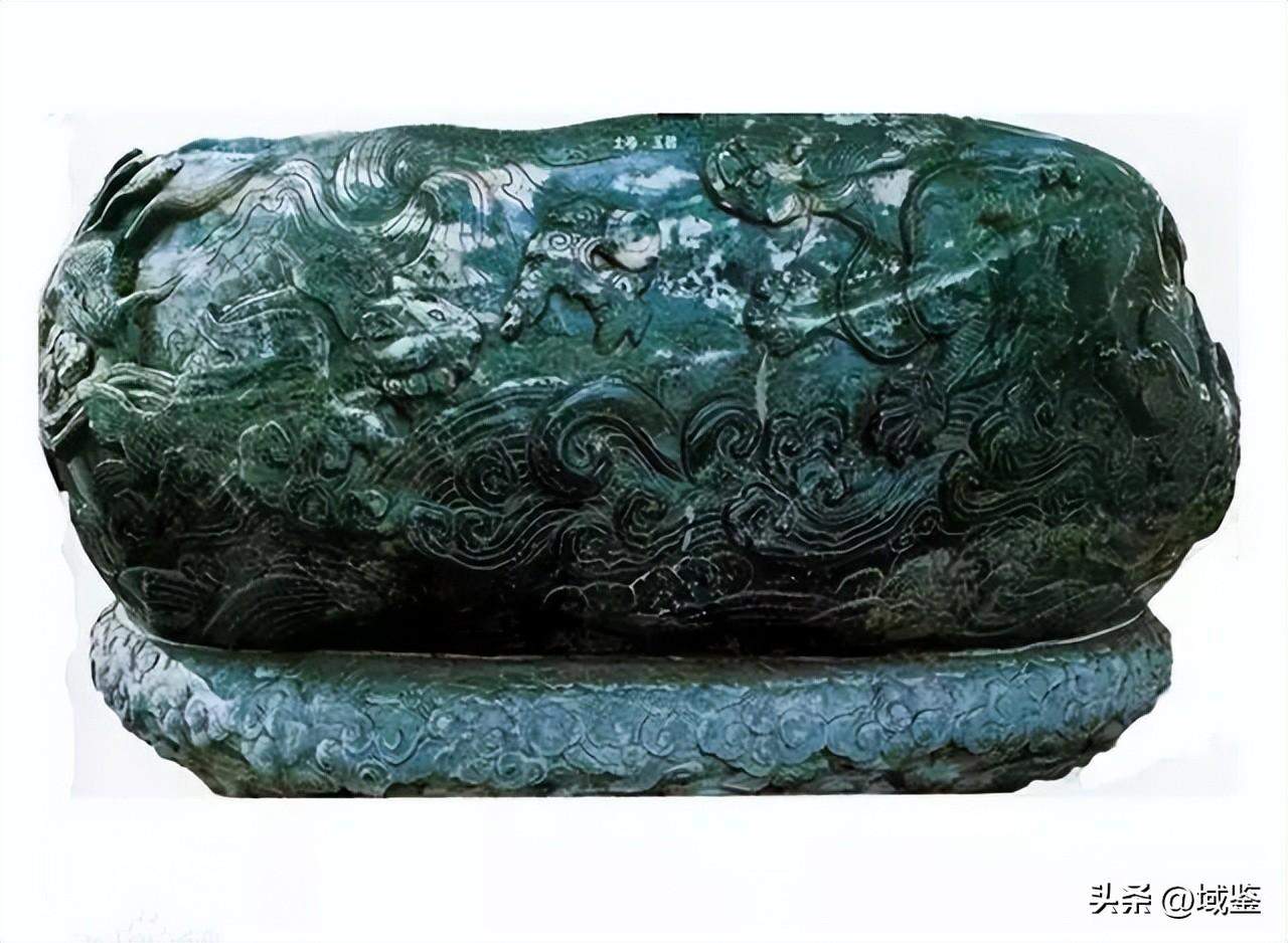 “渎山大玉海”是元代的一件巨型贮酒器,又名玉瓮、玉钵。器体呈椭圆形,口径1.35-1.82、高0.7米,重达3500公斤。