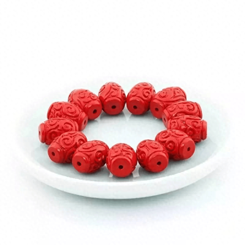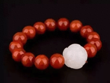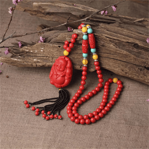 纯度高的朱砂,想做成首饰是很难的,考验匠人们的技术,它的颜色是橘红色,手感发沉,戴的越久,品相越美。