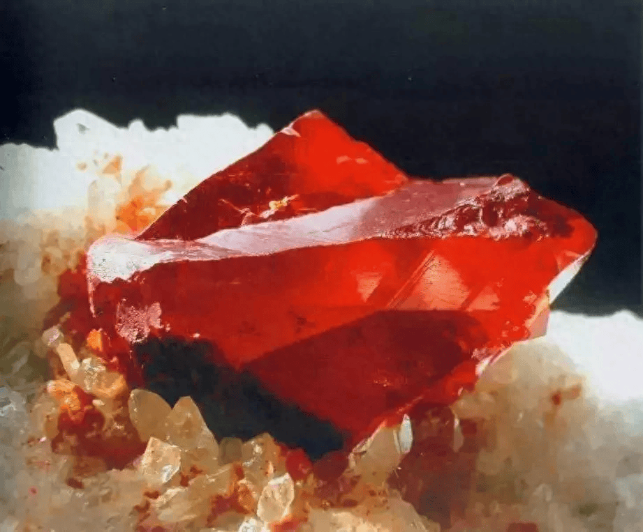 像宝石一样晶莹剔透的朱砂长在方解石、石英或水晶上,打光后看见来很通透,是朱砂里最贵、最好的一种。
