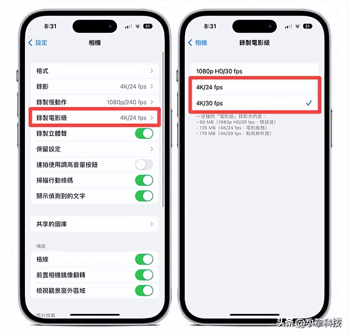 设置方法:打开iPhone「设置」—「相机」—「录制电影级」,选4K模式即可。