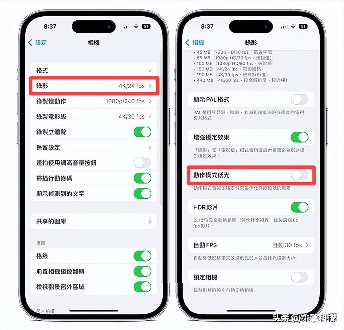 开启方法:打开iPhone「设置」—「相机」—「录影」—开启「动作模式低光」即可。