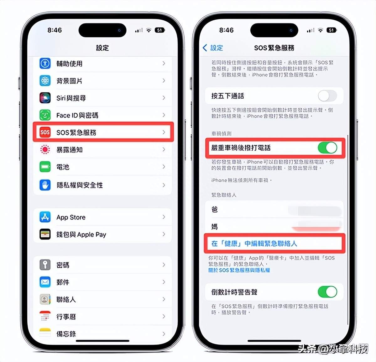 设置方法:打开iPhone「设置」—「SOS紧急联络」— 开启或关闭「严重车祸后拨打电话」功能,然后在下方,点击「在“健康”中设置紧急联系人」。