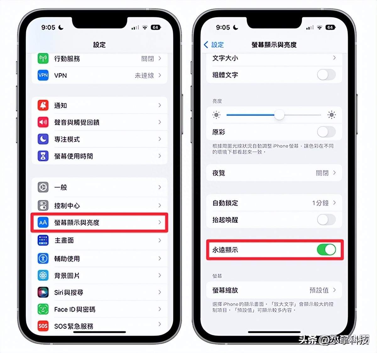 使用方法:打开「设置」—「屏幕显示与亮度」— 打开或关闭「永远显示」。