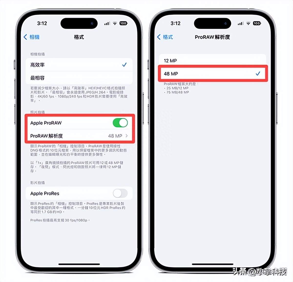 打开iPhone「设置」—「相机」—「格式」中,开启「Apple ProRAW」,并将ProRAW的分辨率改为「48 MP」,然后在拍照时开启RAW, 并使用 1倍主相机进行拍摄。