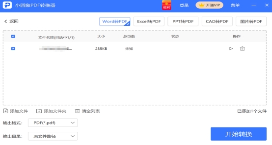 PDF】。进入转换页面后,不需要调整上方功能,直接将doc文件添加到客户端上,然后等到文件上传,上传完毕后,调整输出文件的保存目录,然后再点击【开始转换】,整个过程非常快,可以轻松实现格式的转换!