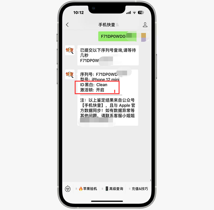 截图是这台iPhone12mini的查询结果。可以看到该机的ID黑白显示【clean】,说明原机主没有开启丢失模式,如果ID黑白是【lost】,说明原机主开启了丢失模式。激活锁则是开启状态,开启就说明该机有隐藏ID,属于ID机。查询的时候一定要注意,先将自己的ID帐号退掉之后再查询,避免查询结果混淆。