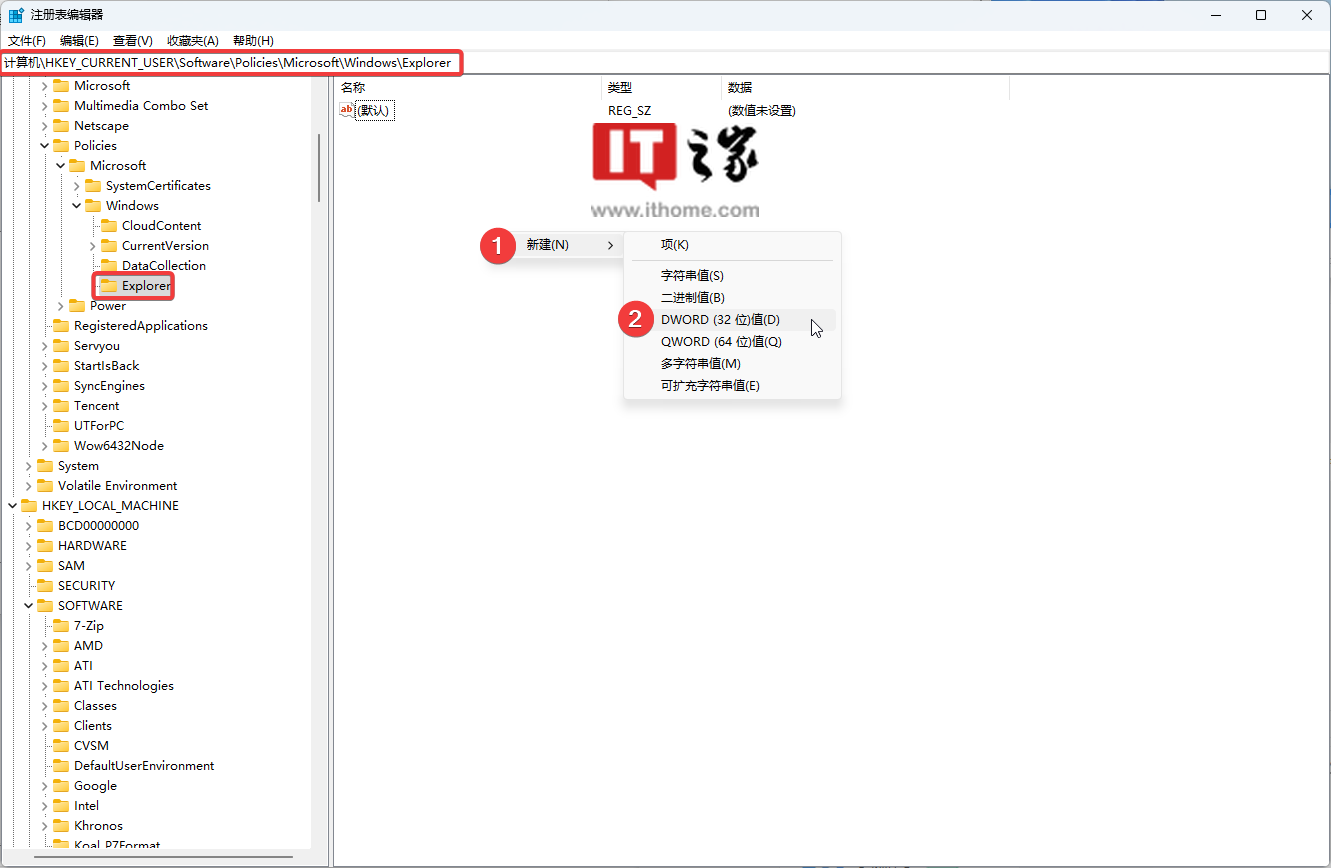 6. 右键“Explorer”文件夹(或者右键右侧空白区域),选择“新建”-》“DWORD(32 位)值”