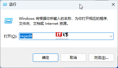 2. 在文本框中输入 regedit 选项,然后点击“确定”进入注册表编辑器