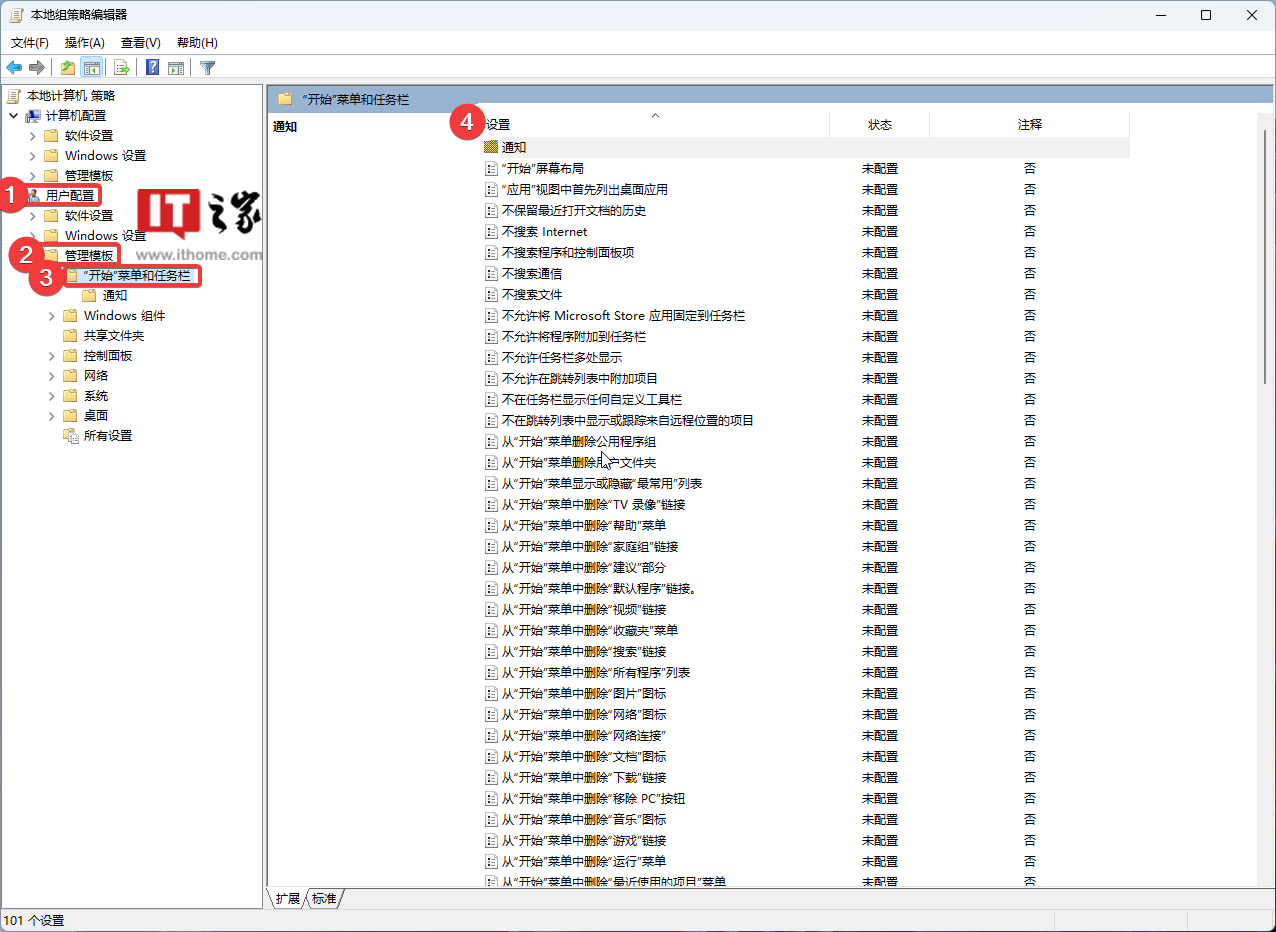 3. 导航到“用户配置 > 管理模板 > ‘开始’菜单和任务栏”