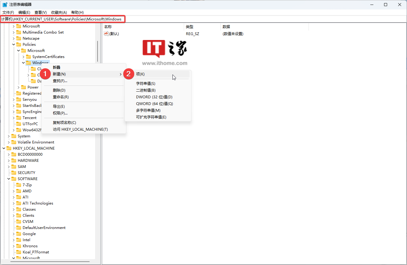 4. 右键“Windows”文件夹(或者右键右侧空白区域),选择“新建”-》“项”