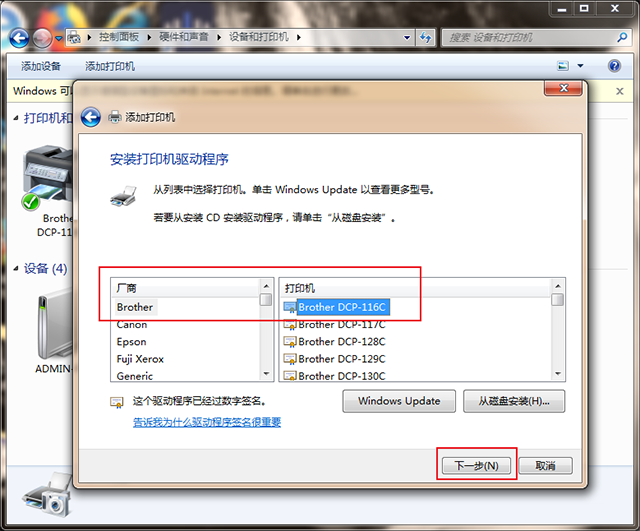 第三步:查看说明书或者打印机上面的【厂商和打印机型号】,在这个窗口里面选择好对应的品牌和打印机的型号,就可以继续下一步。
