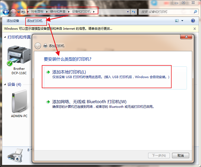 第一步:先将打印机与电脑用USB数据线连接,在桌面上打开【控制面板】,进入后点击【硬件和声音】,然后双击【设备和打印机】,进入打印机和设备的页面后,点击左上角的【添加打印机】,弹出窗口之后,双击【添加本地打印机】。