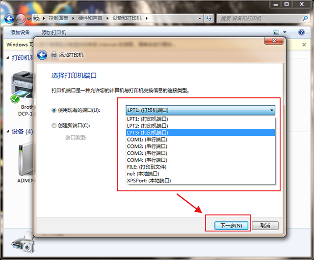 第二步:在这里需要选择打印机的端口,一般在打印机的机子上面会显示端口,或者在说明书上面也有说明,选择好对应的端口,就可以点击【下一步】。