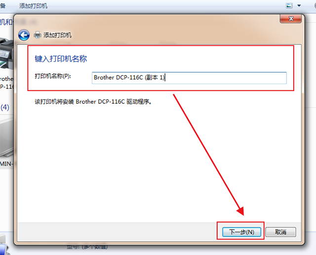 第四步:在这里只需要输入打印机的名称就可以了,输入完成后点击下一步,就会开始安装打印机。