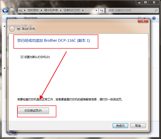 第五步:打印机安装成功后,先不要着急关闭这个窗口,点击左下角的【打印测试页】测试是否正常,如果能打开,并且能开始打印就代表安装成功。如果没有连接成功,就检查一下打印机的电源是否打开,还有就是安装的打印机型号是否正确。